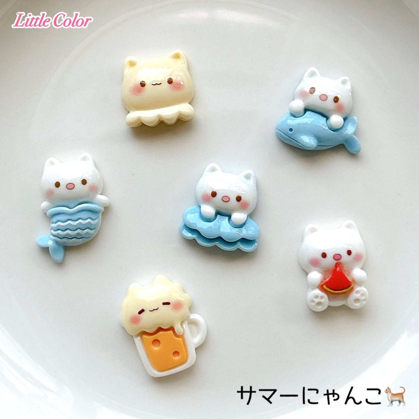 【6個】サマーにゃんこのデコパーツ ネコ / ハンドメイドパーツ 動物パーツ 夏 海 ねこ (H08)