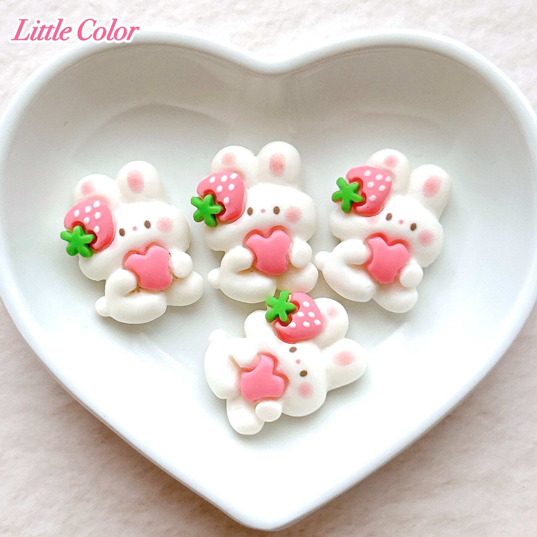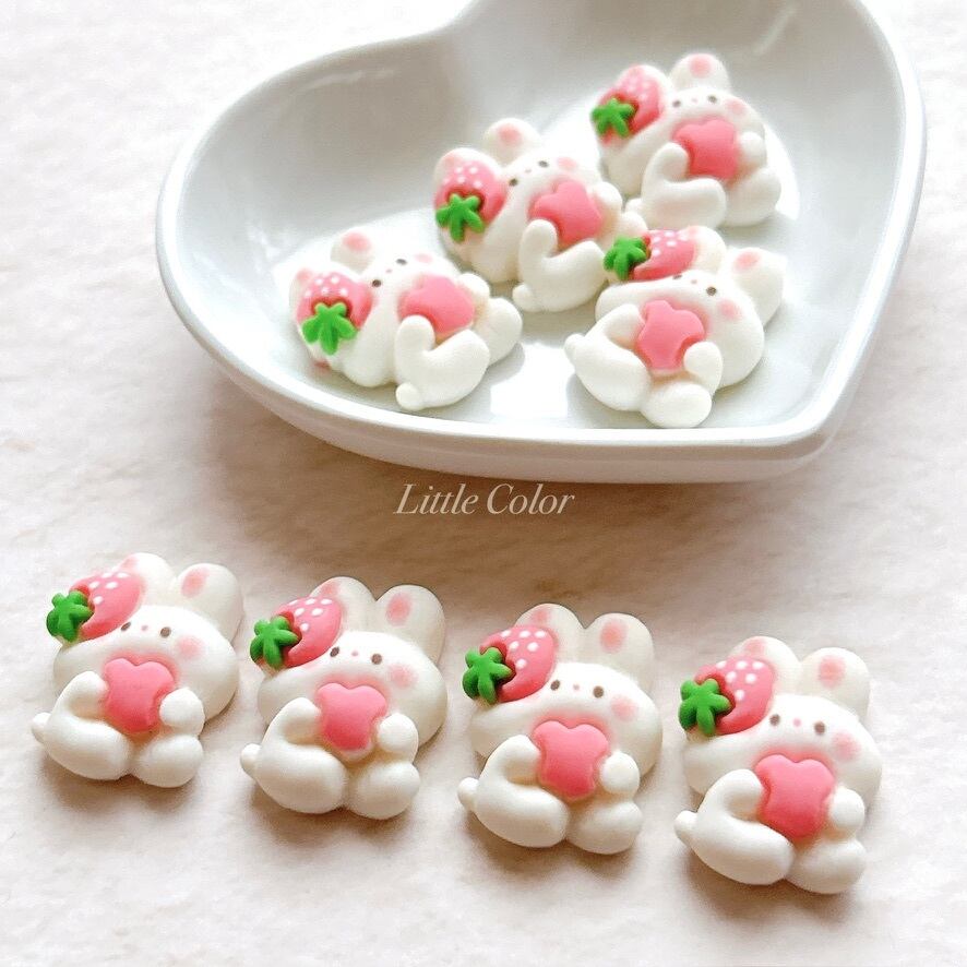 ピンク ハートキャッチ イチゴうさぎのデコパーツ 4個セット / ウサギ ハンドメイドパーツ 動物パーツ(A47)