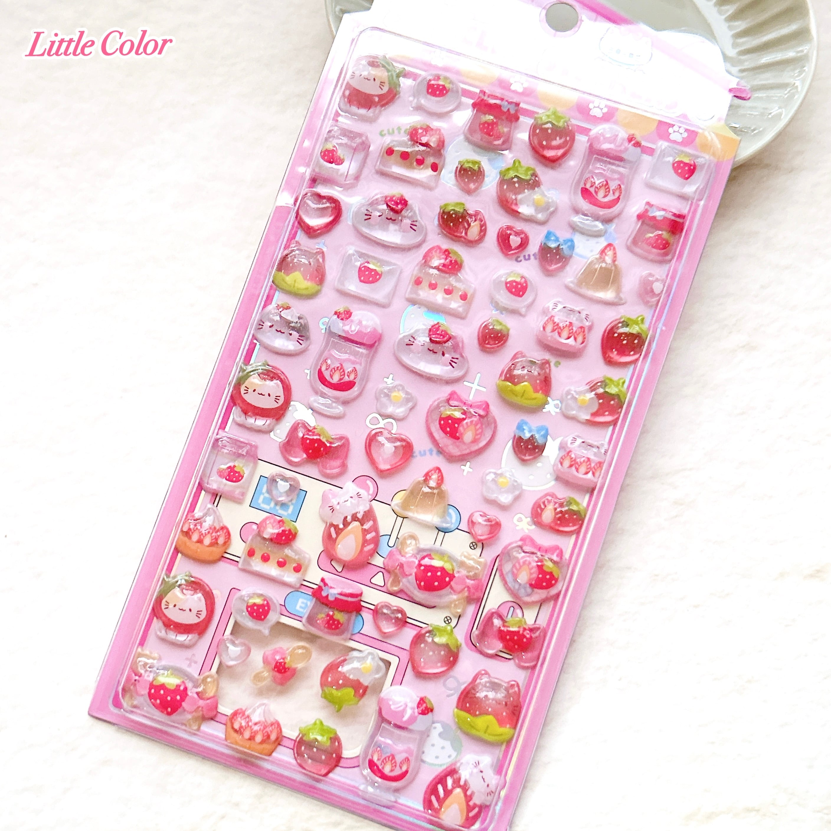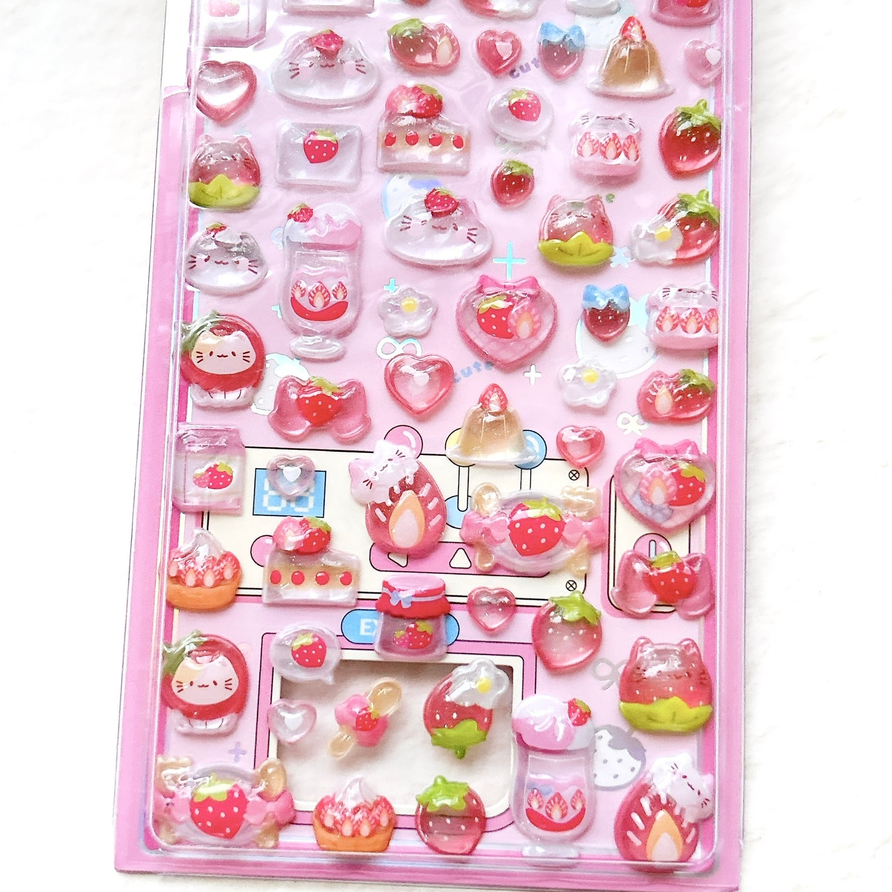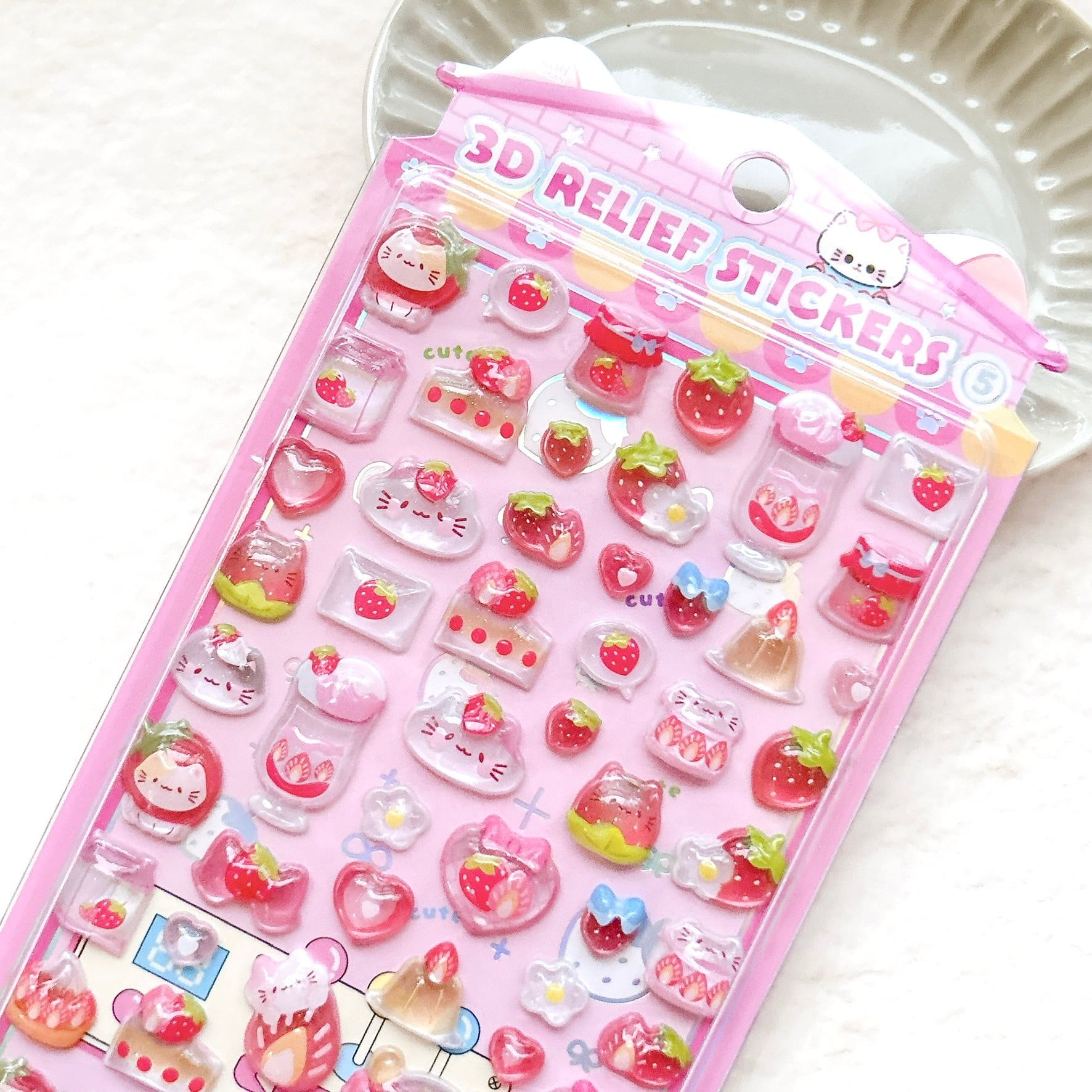【立体シール】3D RELIEF STICKERS ネコ イチゴ ピンク/ ぷっくり ぷくぷくシール